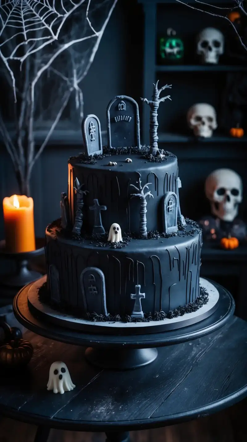 The cake that resembles a spooky graveyard catches your eye. Dark colors and eerie decorations give it a haunting vibe. “I can almost hear whispers!” a friend jokes, sending chills of excitement.