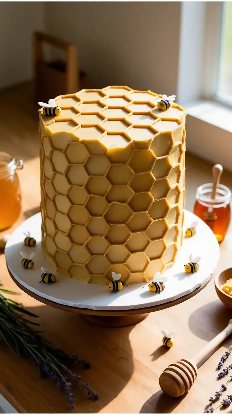 You gaze at a cake with a honeycomb design. The shapes and colors blend beautifully, making it captivating. “Looks good enough to eat!” someone says, laughing.