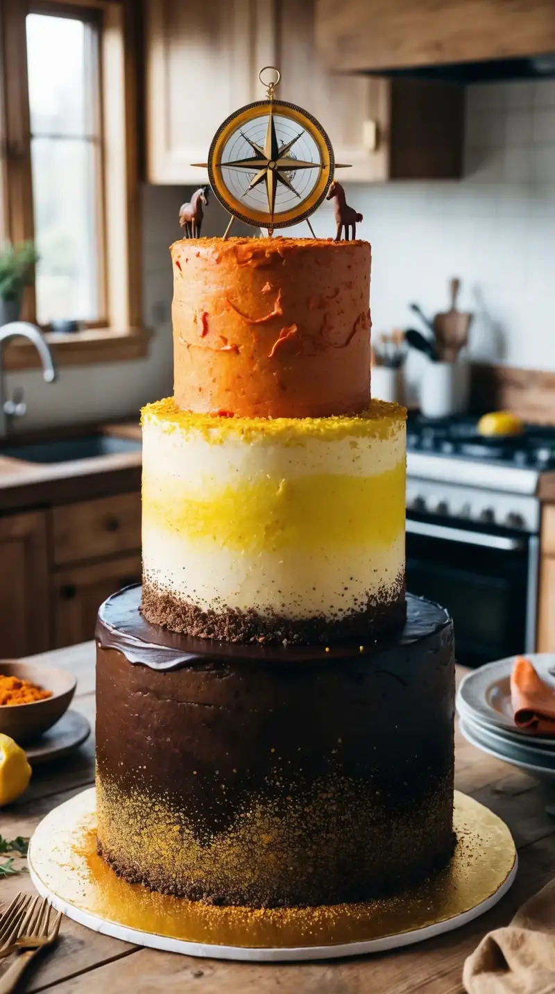 The top layer is a wild berry and lavender cake, representing the lush fields and forests of Europe. The lavender buttercream is light and airy, adorned with edible flowers and a fondant map that traces the journey of a true explorer. “It feels like I’m traveling the world with every bite!” you might marvel, appreciating the variety of flavors.