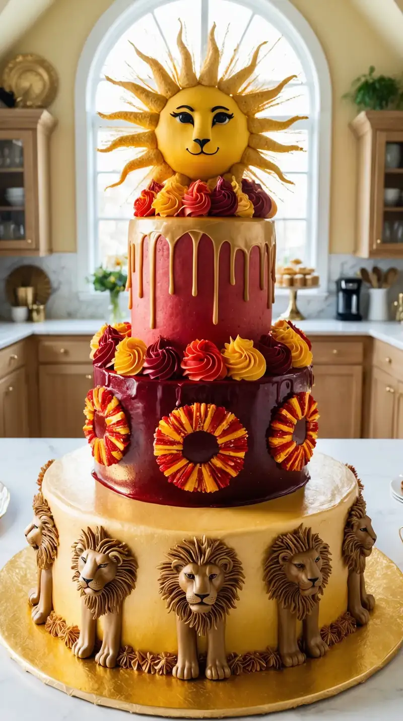 The middle layer is a rich red velvet cake, representing the passionate heart of Leo. It's adorned with vibrant red and orange buttercream rosettes that resemble a lion’s mane, bursting with energy and life. Each bite offers the warmth of cinnamon and a hint of sweet cream cheese frosting, creating a royal feast.
