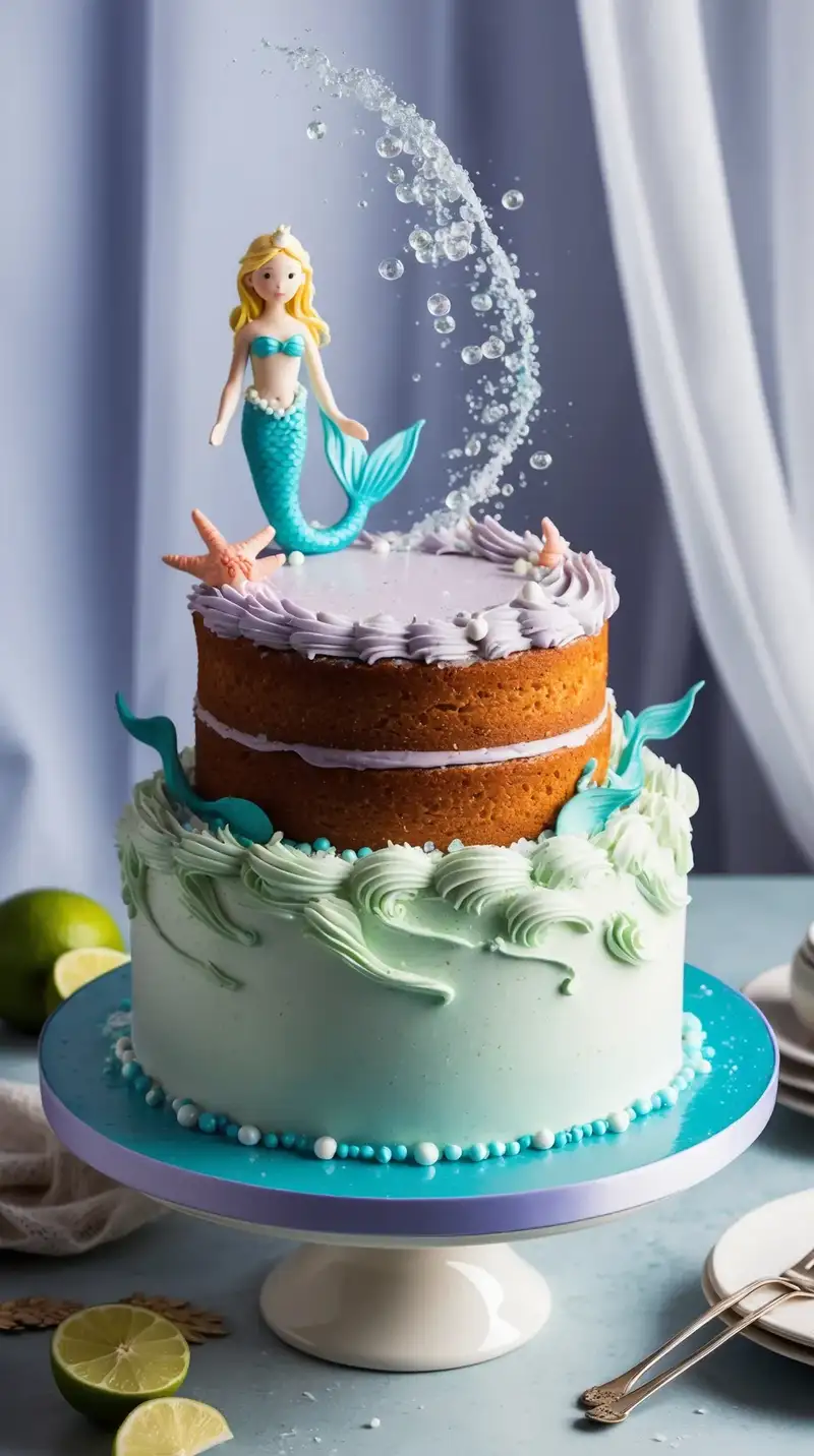 Picture a cake that feels like a dreamy, underwater world, perfect for a Pisces! The Pisces Dreamscape Cake is a magical two-layer creation, each layer offering a serene and enchanting experience. The base layer is a delicate coconut and lime cake, light and refreshing, reminiscent of tropical seas. It’s frosted with a pale teal buttercream, smooth and calming, like the surface of a tranquil ocean.