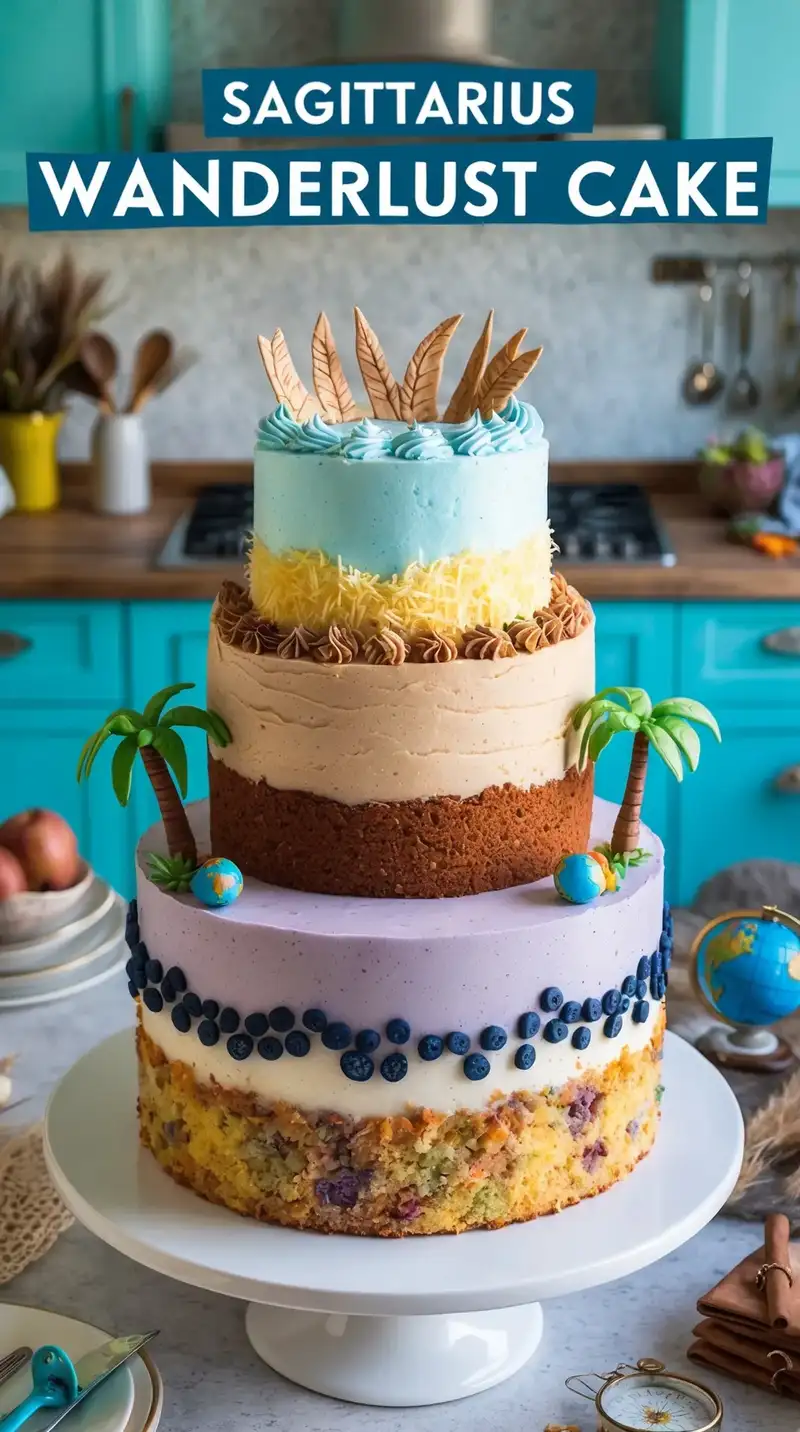 Imagine a cake that’s as adventurous and free-spirited as a Sagittarius! The Sagittarius Wanderlust Cake has three layers, each representing a different part of the world. The base layer is a rich coconut and pineapple cake, evoking the tropical warmth of the islands. It’s covered in a pale blue buttercream, like the clear sky on a bright day, with edible palm trees swaying on the side.