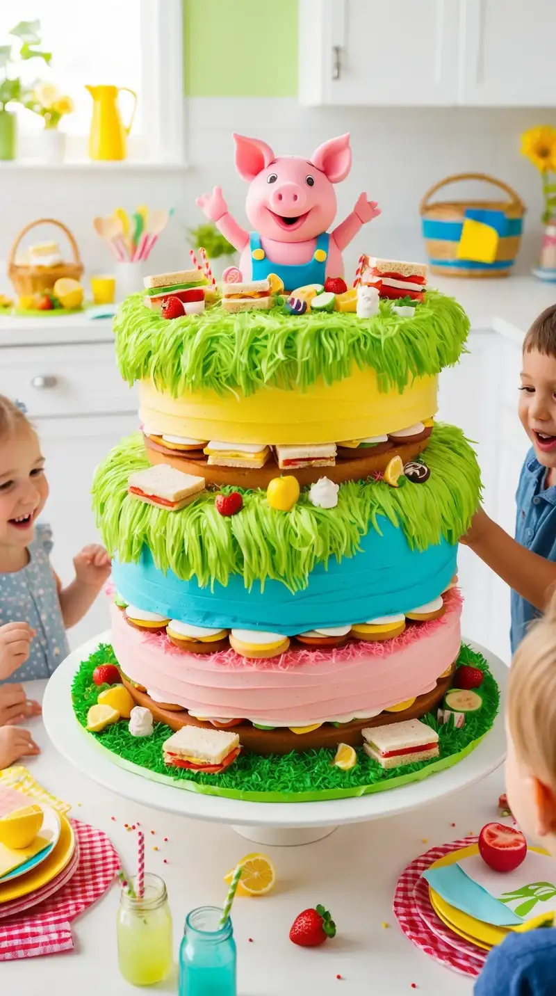Close your eyes and picture a delightful picnic scene. The Piggy Picnic Cake captures this perfectly. Three colorful layers peek out from under a fluffy, green fondant blanket. A friendly pig waves from the top, surrounded by fondant sandwiches and fruits. Laughter and chatter fill the air as children pretend to nibble on the tiny treats. It’s a scene that brings everyone together, savoring each moment of happiness.
