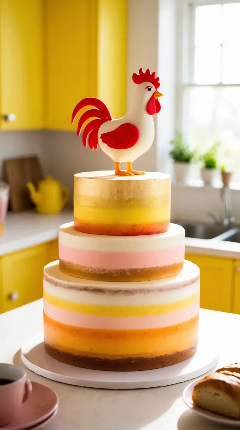 As the sun rises, so does the Rooster Sunrise Morning Cake, full of color and warmth. Layers of cake shimmer with golden yellow, soft pink, and vibrant orange, blending perfectly. A fondant rooster proudly sits on top, welcoming a new day. Friends smile, feeling energized just by looking at it. It’s like a happy morning in cake form, ready to brighten everyone’s spirits.