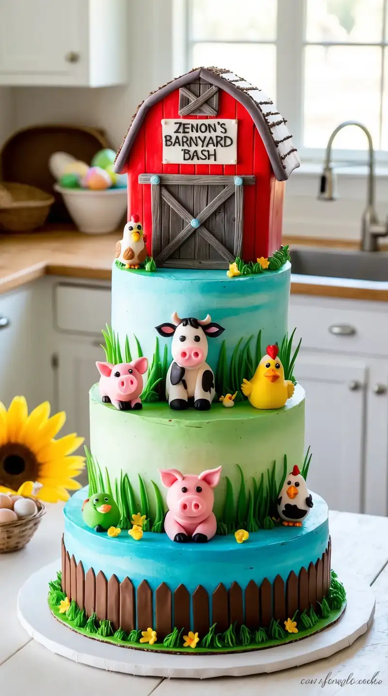 Picture yourself in a bright, colorful world. The Zenon's Barnyard Bash Cake captures the magic of a sunny farm day. Three big tiers stand tall, each one telling a story. Can you see the tiny barn door on top? It’s got a little sign that reads, “Zenon’s Barnyard Bash.” Friends gather 'round, gazing at a miniature pond filled with fondant animals. A cow, a pig, and a chicken all hang out together. Each layer, with its own tasty surprise, beckons smiles and cheers.